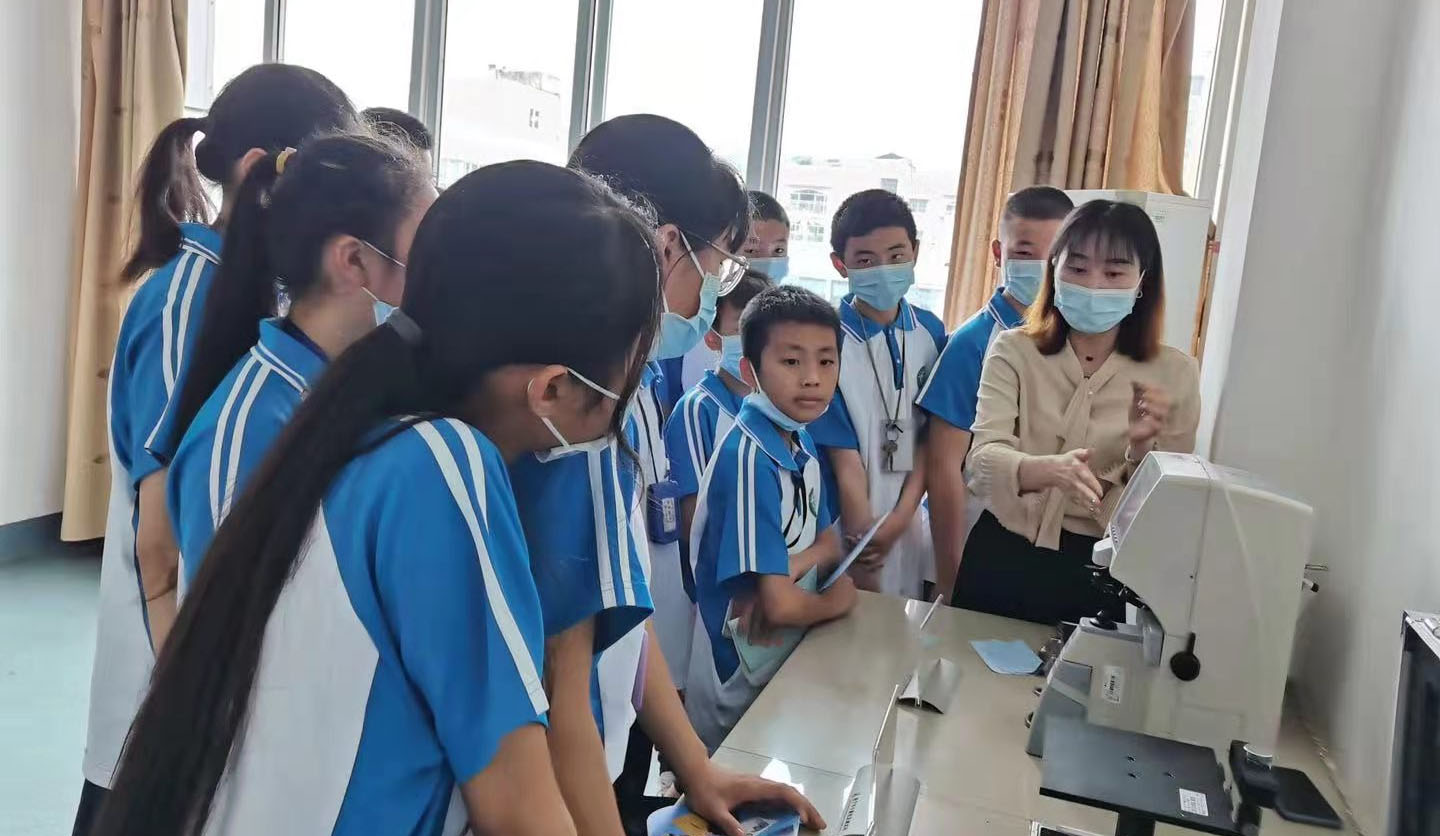 ? ? “健康計量走進學(xué)校”活動現(xiàn)場,公司工作人員用專業(yè)的計量儀器設(shè)備為學(xué)生們檢測眼鏡質(zhì)量,講解愛眼護眼相關(guān)知識。